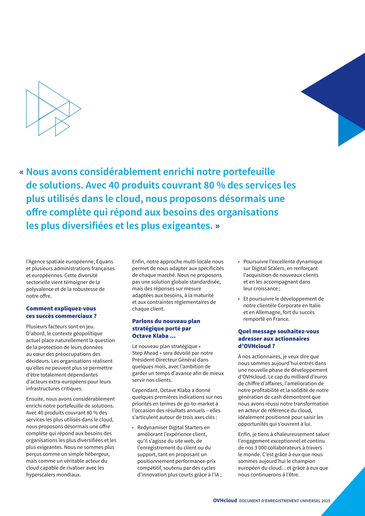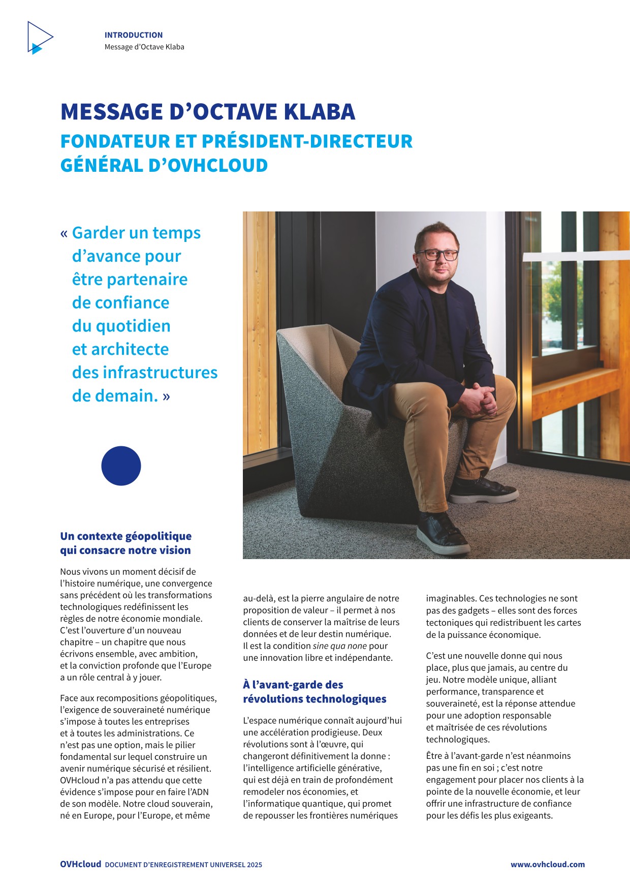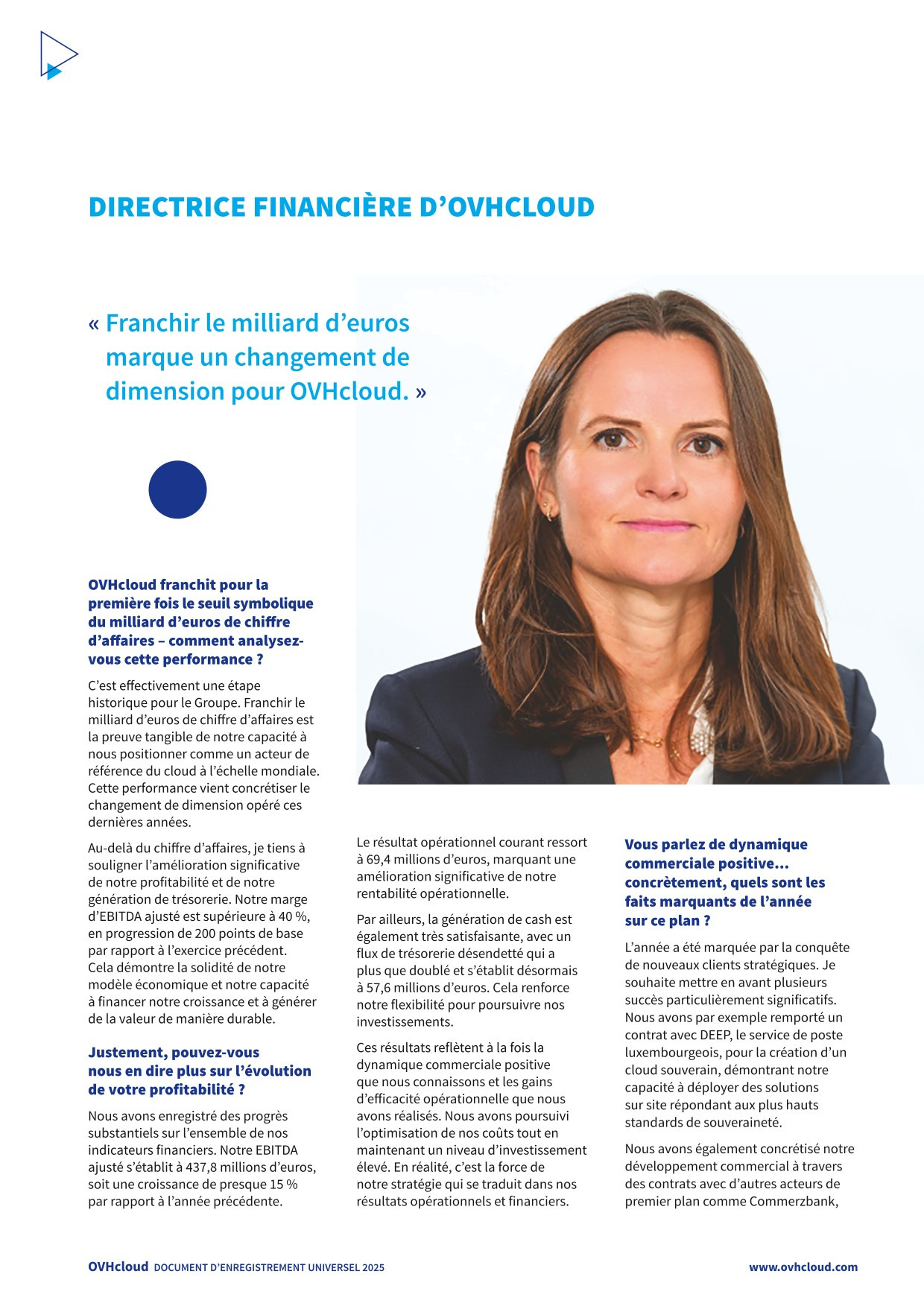 En 2025, OVHcloud a lancé On-Prem Cloud Platform, une plateforme cloud prête à l’emploi et installée chez le client. Ce lancement s’est matérialisé par la signature d’un contrat commercial avec DEEP. Le 31 mars 2025, DEEP, filiale du groupe Post, le leader des services télécoms, ICT, postal et financier postal du Luxembourg, et OVHcloud ont signé un partenariat stratégique pour la mise en œuvre d’un cloud souverain au Luxembourg. Le cloud souverain DEEP s’appuiera sur la solution On-Prem Cloud Platform (OPCP) d’OVHcloud : une plateforme cloud intégrée (matérielle et logicielle) qui sera, en mode déconnecté, hébergée et opérée de façon autonome par DEEP dans ses propres centres de données certifiés « Tier IV » situés au Luxembourg.