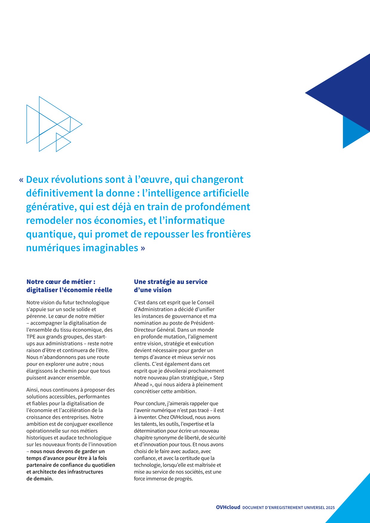 La position d’OVHcloud en tant que premier fournisseur européen de cloud remonte à sa fondation en 1999 en tant que société d’hébergement Internet en France. Au cours des vingt-six dernières années, OVHcloud s’est considérablement développé, d’abord en accroissant son infrastructure et en élargissant sa présence en Europe, puis en diversifiant ses offres de cloud et en étendant ses activités à l’échelle mondiale.